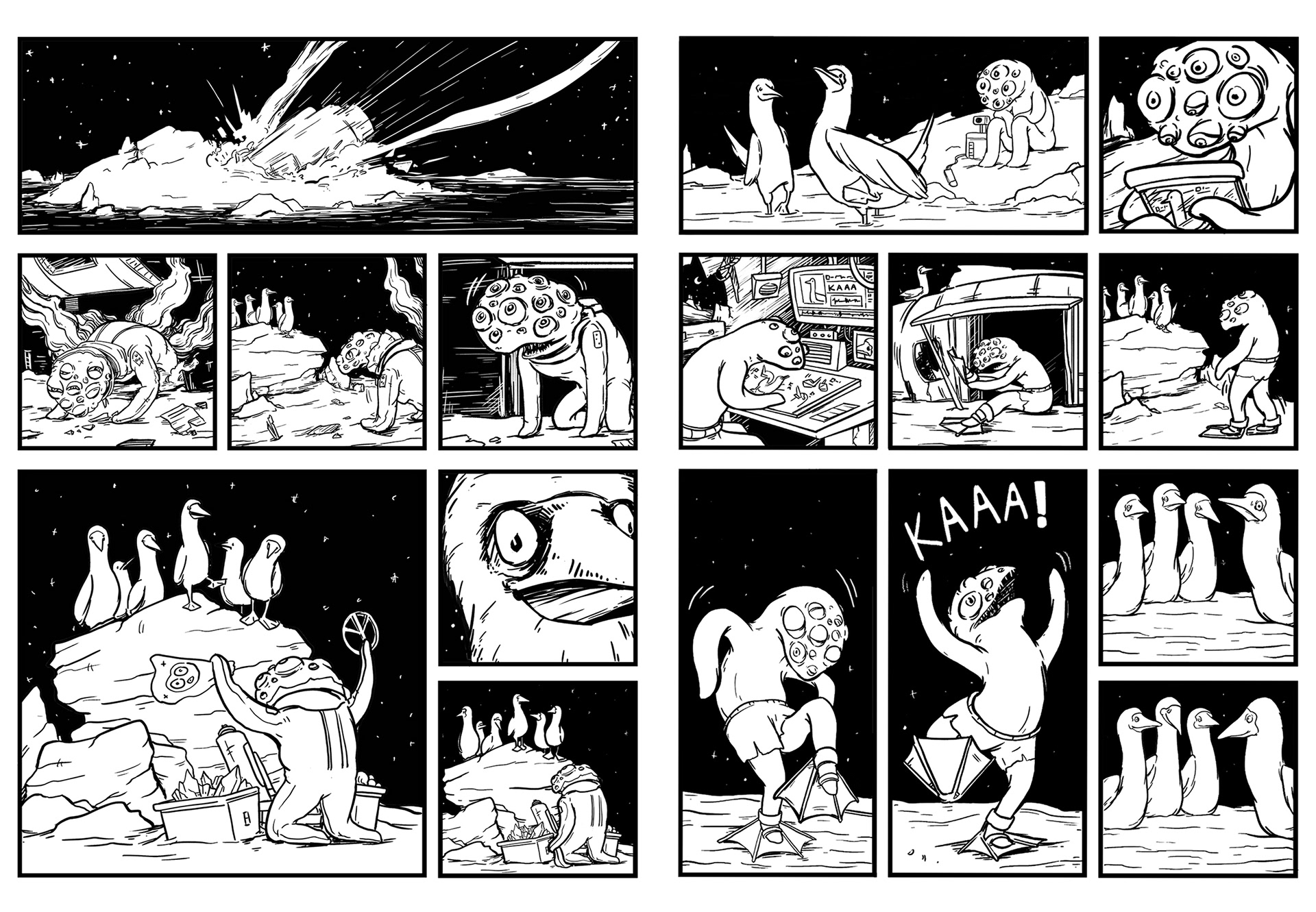 Silent comic about and alien who crashes in to a deserted island, and assumes that the island birds are the intelligent creatures of Earth. Turns out he is not wrong.